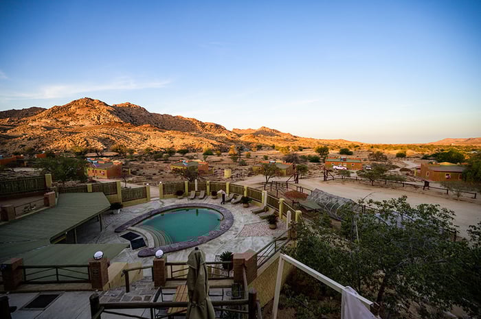 After a day’s exploration, you’ll be happy to dive into the pool at Damara Mopane Lodge. When the earth starts cooling down, embark on a guided walk to learn more about the vast vistas. There are several trails to explore the fauna and flora on your own time too.