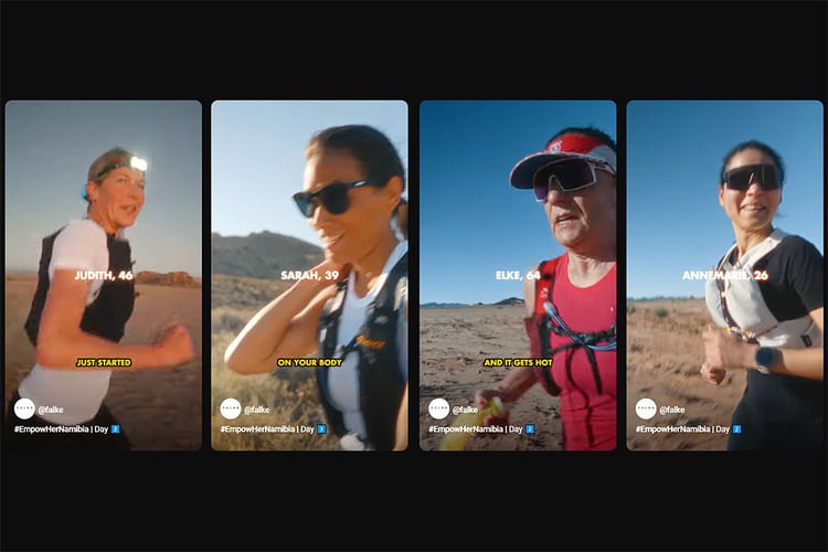 The marathon series started in the Kalahari [https://gondwana-collection.com/en/the-kalahari-experience]. There, the runners Annemarie (26), Sarah (39), Judith (46) and Elke (64) found the sand particularly difficult. The next day, the four enjoyed the vastness of the landscape at the Fish River Canyon in the arid region of the Nama Karoo. The biggest challenge of the third marathon was the 600 metre difference in altitude through the granite mountains of Aus on the edge of the Succulent Karoo. The crowning finale was the 42.2 kilometres at the foot of the Petrified Dunes in the Namib Desert. The Falke film team captured impressions of the runs in four video clips and published them on YouTube.