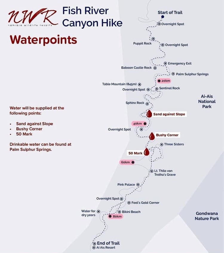The season for the Fish River Canyon Hike from Hiker's Point to ǀAi-ǀAis starts on 1 May and ends on 15 September. The tour must be booked in advance with NWR. Hikers have to present a health certificate from a doctor and they must hike in groups of at least three members.