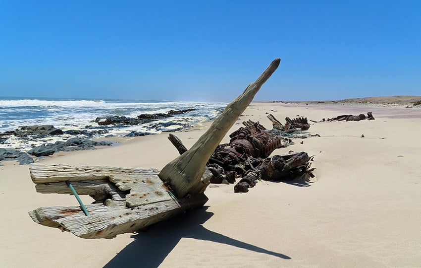 The Damaraland scenery transforms to desert as I near the coast. When I see a haze over the horizon, I think it to be the inevitable coastal mist, which provides the moisture vital for Namib Desert life, but soon see that it is sand being blown helter-skelter by the strong wind and I’m quickly enveloped by it. It eventually clears and I start to think about this notorious stretch of coastline. The Skeleton Coast is known for whale and seal bones, and flotsam and jetsam, as well as the treacherous currents which have got many a vessel and seafarer into trouble. This has erroneously led to the belief that it is dotted with the remains of shipwrecks. Truth be told however, the first part of the route is through gravel plains and desert, and the ships that have come to grief along the coastline break up very quickly leaving little evidence of their existence. It is only the more recent wrecks that are still visible. And before I reach the Ugab Gate I make a turn at the remains of the South-West Seal, a 90-ton South African fishing vessel that caught fire and was beached here in 1976, its rotting ribs jutting out of the sand next to a crashing sea. It’s the real deal. There are even whale bones lying on the beach adjacent to it.