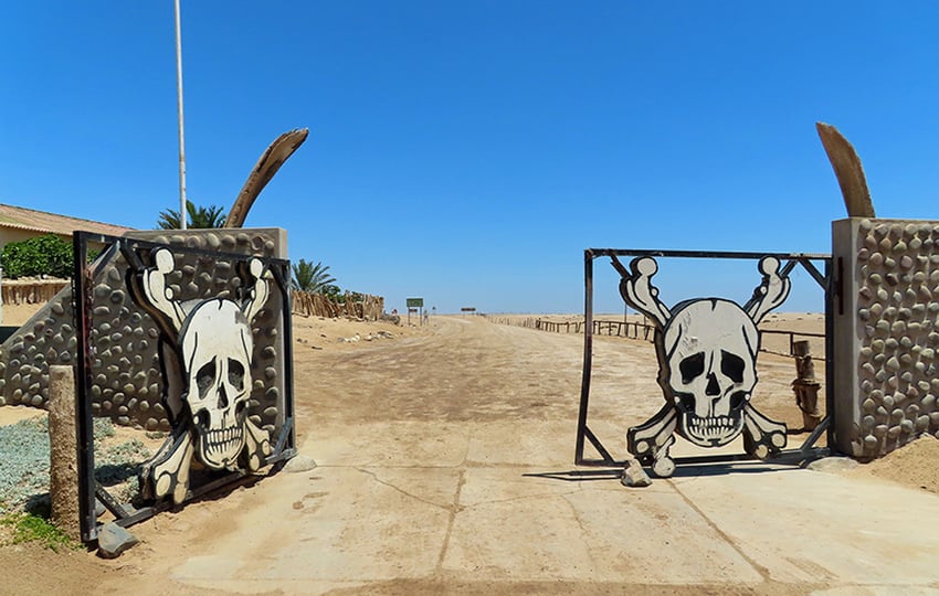 And then there is no avoiding the anticipated crossing as I approach the Ugab River, like it or not. I have not seen another vehicle on my drive down the coast so am pleasantly surprised to see a bakkie gaining on me. It’s in the nick of time. I step out of the vehicle to discuss the muddy river crossing, but the vehicle veers to the right following the path on the side of the river and the driver gestures for me to follow. There is no time to hesitate as he is moving quicky ahead and I will soon lose his tracks. I have to put foot to keep up with him and have a moment of panic when I find myself sinking into a muddy hole excavated by previous vehicles. The sludge sucks in my fierce chariot and slows it down to a near stop. I quickly change gears and give more fuel and it chugs forward out of the mire. I meet the driver in the office, heed his good (although belated) advice about how to cross tricky muddy sections like this before he says his goodbyes and disappears as quickly as he arrived. I thank my angels and continue through the Ugab Gate, painted menacingly with skull and crossbones.