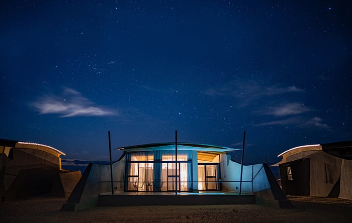 The Desert Grace offers a grounding experience in that it has been entirely constructed out of bags filled with Namib sand. Moreover, the layout of the rooms imitates the natural lines of sand dunes. Every component of this lodge has been meticulously considered and thought through.