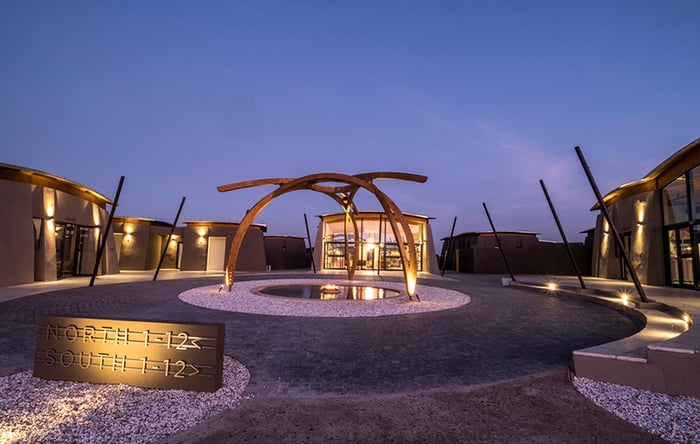 After entering Gondwana Namib Park, a trail of pink-rimmed road signs leads to The Desert Grace, like a map leading to treasure.