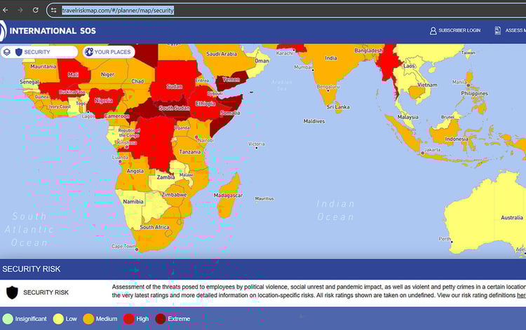 Botswana, Zambia and Malawi fall into the same category, as do Australia and European countries such as Germany and France. South Africa, on the other hand, is orange-brown. According to International SOS, travellers there are exposed to a medium risk.