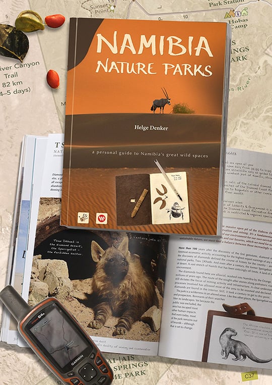 The 428-page guidebook “Namibia Nature Parks - a personal guide to Namibia’s great wild spaces” with maps, 650 photos, sketches and illustrations by the Namibian nature expert Helge Denker was published by Gondwana Collection Namibia. Support came from Namibia’s financial giant, the Capricorn Group. The book was printed in Windhoek by John Meinert Printing. Proceeds from the book sales flow into support for community conservation in Namibia. The funds will be administered by the Gondwana Care Trust.