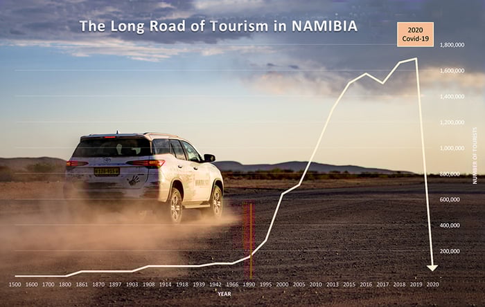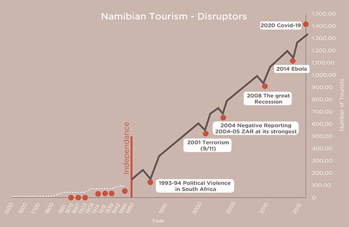 When I recently travelled to the Namib Desert, the effects of Covid-19 really struck home. The roads were empty of travellers. We hardly saw another vehicle at Sossusvlei, one of Namibia’s prime destinations, which was in the headlines a few years ago when people were concerned about the effect of ‘overtourism’ (mass tourism) on the fragile environment. Instead of the 1000-plus visitors who visit the site daily, we had the towering star dunes all to ourselves. Wandering around the picturesque and ancient pan of Deadvlei, one of the most scenic spots in Namibia, I felt heartsore that my country had nobody to appreciate and celebrate it. I was reminded of a tourism graph I drew up in 2016, showing the crests and troughs of tourism over the last century and the increase of visitors per year. I realised with a shock that international tourism is now the lowest it has been in a hundred-year period, after months of lockdown and restricted travel. 2020 will be recorded in history books as the year when tourism teetered at the edge. The question remains whether many in the hospitality sector, Namibia’s most sustainable industry, can survive Covid-19 and how tourism will change because of it.