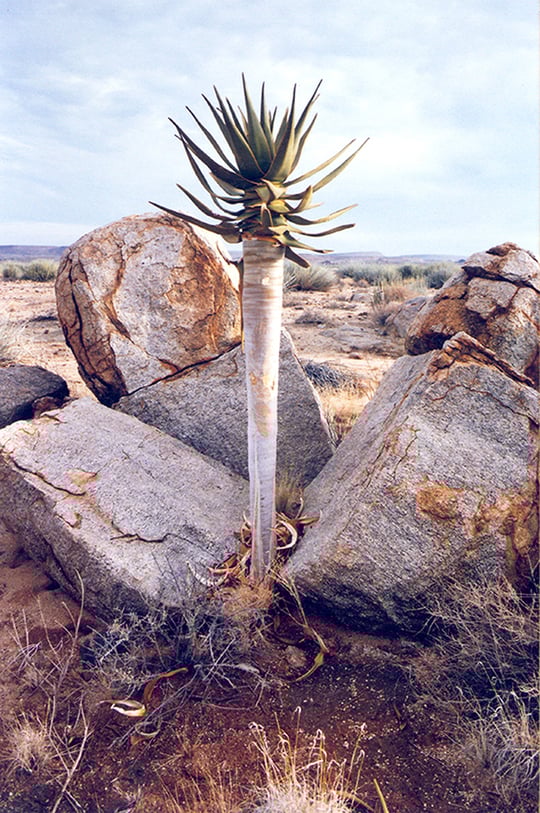 Young quiver trees are usually difficult to find and not immediately recognised as such by laymen, because in general they only survive in sheltered spots, in crevices between rocks or under shrubs and other “nursing plants”. Thus protected the seeds and seedlings get more moisture and are less exposed to wind and sun and during their early years they are hidden from folivores.