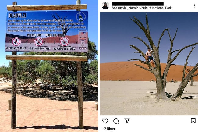Outrage on social media: A so-called influencer poses on one of the dead camel thorn trees in Dead Vlei near Sossusvlei. And proudly posts it on Instagram. Not for long, though. The "shitstorm" of comments is so intense that he first deletes the photo and then his account.