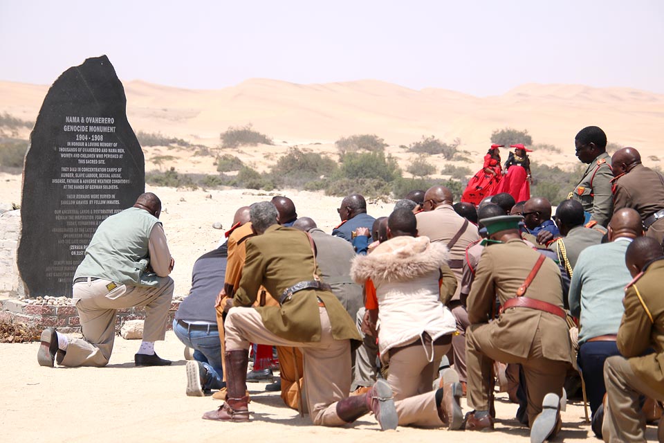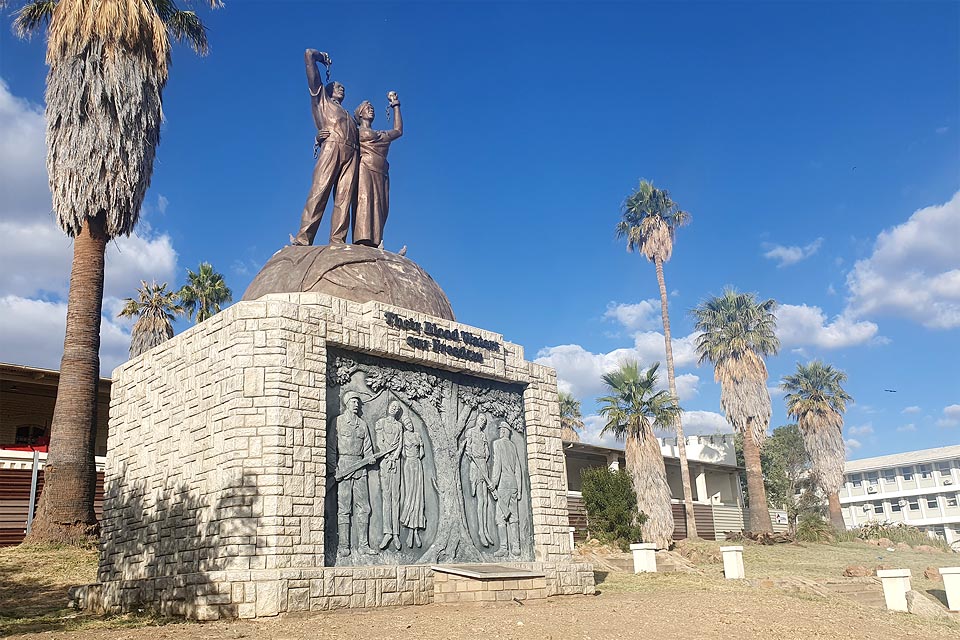 Namibia's President Nangolo Mbumba (r) unveils the bust of the former Paramount Chief...