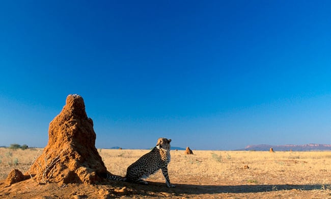 In Namibia, the large, cone-shaped sand towers in the landscape are among the most popular objects for tourists to take souvenir photos with. Tiny creatures - small, beige-white termites that are only two centimetres long – with the exception of the queen, who is huge compared to her colony - build these mounds.
