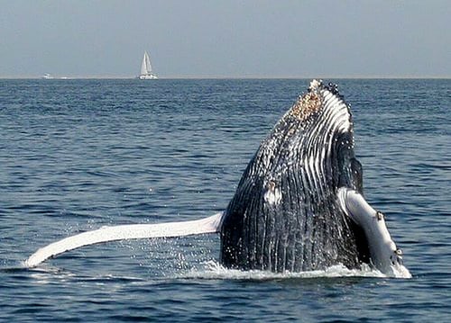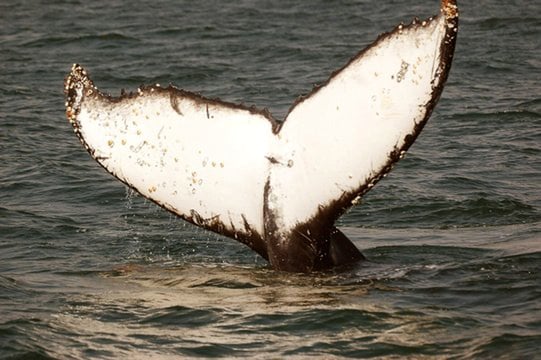 A splash of water suddenly rises, followed by loud snorting. As if out of nowhere, a large grey body rises out of the waves, turns in the air and hits the water surface. The humpback whale shows its white fluke, then swims past the bow of the boat, pushes air and water through its blowhole again, then dives into the water.