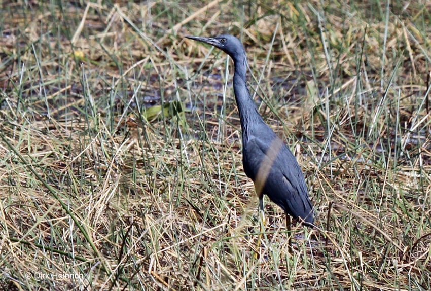 The largest heron as well as the smallest and the most threatened members of the heron family can be found at the Okavango, Kwando, Zambezi and Chobe rivers in north-eastern Namibia. The Goliath Heron, the Rufous-bellied Heron and the two bittern species also occur at the Kunene River in the northwest. In years with plentiful rains they move to other parts of the country, especially the bitterns, and breed at pans and similar small seasonal bodies of water which offer sufficient food for a limited period of time. I ringed Dwarf Bitterns at a pan on the farm Wiese between Rehoboth and Uhlenhorst and found nests there. A Dwarf Bittern was also caught in a net and ringed at the Kunene River’s mouth.