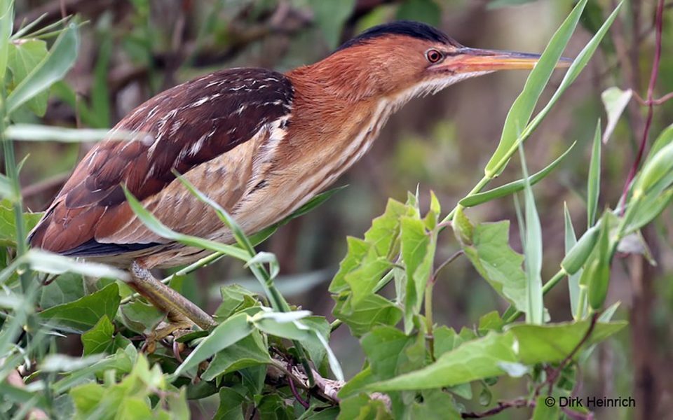 There is a faint movement in the dense reeds. As soon as the Little Bittern feels being watched it points its bill vertically upwards and attentively looks around for the possible danger. It is able to look past the raised beak with both eyes. In this well-camouflaged spot in the dense plant growth it is difficult to discover the bird. The Little Bittern (Ixobrychus minutus) and the Dwarf Bittern (Ixobrychus sturmii) are the smallest species of heron in Namibia: the Little Bittern stands close to 36 cm tall and weighs 110 g, while the Dwarf Bittern is 30 cm tall and weighs 140 g. They feed mainly on frogs, small fish and aquatic insects.