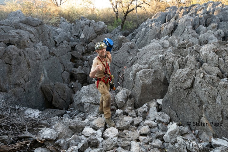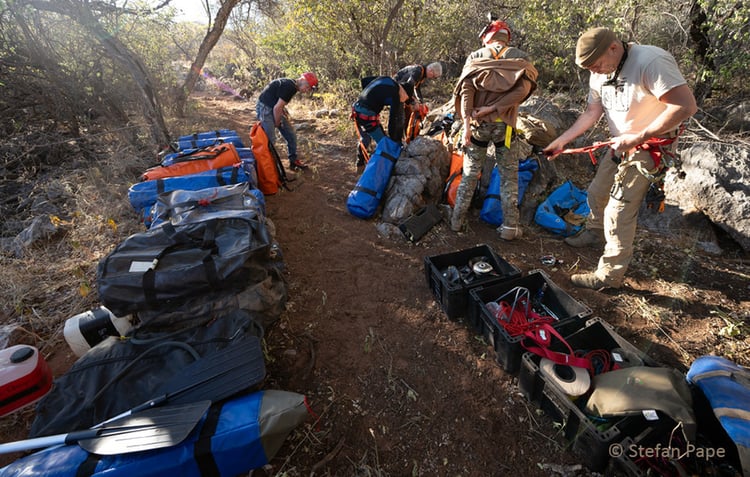 All members of the Scapehander Club are experienced cave divers, who have trained in flooded mine shafts using state of the art equipment but had to learn and practise to abseil and climb up a rope for the adventure in Namibia. They had to find innovative ways to get their equipment 85m underground through narrow holes and crevasses. Waterproof bags, measuring 40 x 60 cm, had to be made to be able to transport most of the equipment down to the underground lake’s surface onto boats and rafts that had to be assembled in a big enough space in the ceiling.