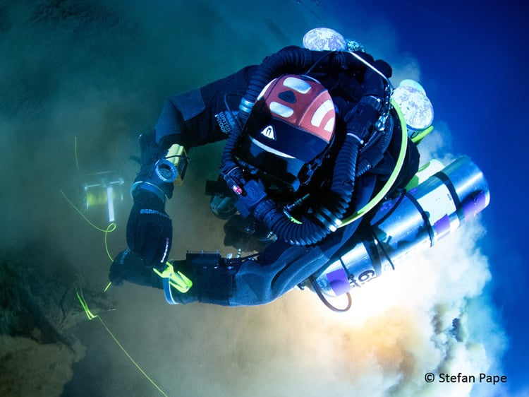 Strict diving ethics were applied, meaning that nothing was left in the cave or the lake except for the lifeline, which is now suspended from the starting point of the 157m dive mark, from where the divers turned back. Even urine flasks were removed again!