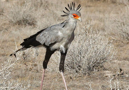 Introduction: The secretarybird (Sagittarius serpenarius) inhabits open grassland with trees and shrubland with Acacia trees, but is absent from rocky hills and dense woodland. The sight of them striding across their grassy range, head down on the lookout for prey is a truly memorable occasion. They can be active throughout the heat of the day, roosting singly or in pairs in the crown of thorn trees, or in their nests. Dust bathes during the day.