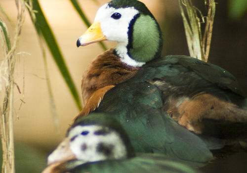 Description: The genus Nettapus are very small ducks with sturdy, sharp-tipped bills. Males have characteristic glossy green uppers with the corresponding region being duller in females. The legs and feet are grey. Auritus is the Latin word for eared.