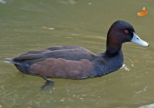Description: Small to medium-sized duck with characteristic red eye, blue-grey bill, black nail and grey legs and feet with black webs.