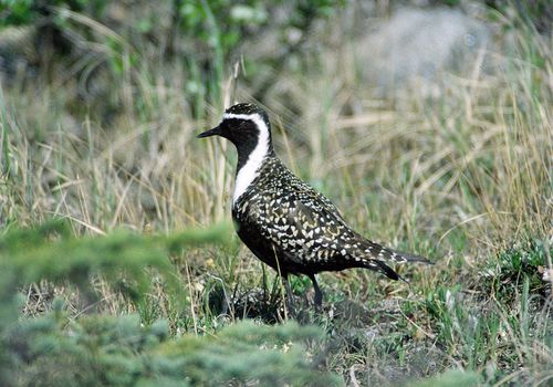 The American golden plover inhabits coastal wetlands with dry vegetation as well as sandy beaches.