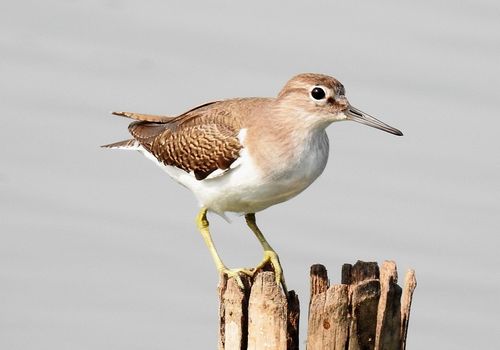 Description: White underparts (hypoleucos), short legs and slightly decurved bill.