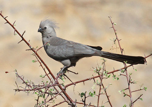 Introduction: Grey-go-away-birds (Corythaixoides concolour) or grey-louries inhabit dry savannah especially with Acacia trees and in dry riverine woodland. Also found in numbers in suburban gardens. Prey of many eagles such as African goshawk and Perigrine Falcon as well as genet. Locally nomadic in response to fruit availability. Found in groups of 3 to 20, although singly and in pairs as well. A feature of this bird is to climb and jump around in trees whilst showing off the crest by raising and lowering it.