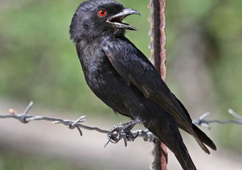 Introduction: The wide habitat range of the fork-tailed drongo (Dicrurus adsimilis) includes riverine woodland, grassland, gardens, farmyards and town parks. Usually found singly or in pairs and up to 20 birds where sufficient perching positions and food sources are available. Bathes by plunge-diving. Rain-bathes during light rain by spreading their wings and tail and raising the back feathers.