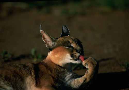 Introduction: The name caracal (Felis caracal) is derived from a Turkish word 'garah-gulak' or 'black ear'. They were once tamed and trained for bird hunting in Iran and India. They were put into arenas containing a flock of pigeons and wagers were made as to how many the cat would take down, hence the origination of the expression 'to put a cat amongst the pigeons'. Apparently it is capable of leaping into the air and knocking down 10-12 birds at one time!