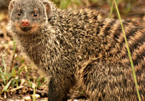 Introduction: Banded mongooses (Mungos mungo) are a sturdy little animal with a large head, small ears, short, muscular limbs and a long tail, almost as long as the rest of the body. They live in regions of dry, thorny bushland, open savannah, or open forest and grassland areas, especially near water. The banded mongoose is especially common in areas with many termite mounds that serve as housing and food.