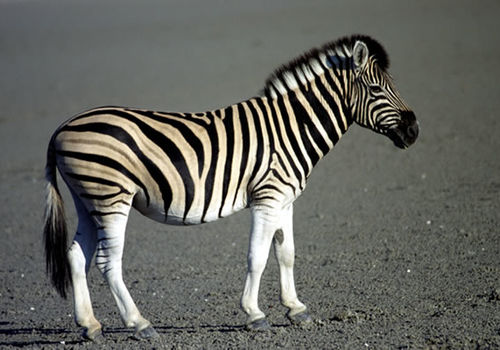 Colouring: The characteristic pelages of the zebra make them easily identifiable. The coat is broad black stripes on an off-white body, with shadow stripes superimposed on the off-white stripes. The stripes extend down the underparts. The mane is short, erect and bristle-like.