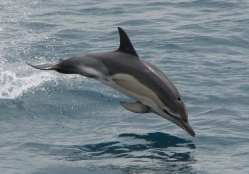 Introduction: The common dolphin (Delphinus delphis) is is a popular attraction on a dolphin cruise from either Swakopmund or Walvis Bay, because individuals ride the bow-waves of sea-going vessels. It is one of the more gregarious of cetaceans and can be seen in schools of hundreds. While feeding, it can dive to depths of up to 250m for as long as 8 min. Common dolphins whistle to communicate with other members of their own species and use sonar for echolocation.