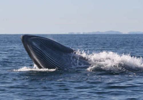 Introduction: Bryde's whale (Balaenoptera edeni) is not a deep diving whale, normally spending only 3 minutes under water. It is usually seen singly or in small groups of 2 or 3 individuals. Larger groups of between 6 to 8 form when feeding. This is an inquisitive animal,and will often approach boats, so look out for them on boat cruises from either Swakopmund, Walvis Bay and Sandwich Harbour.