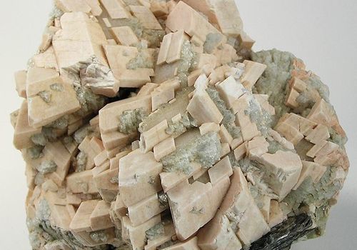 Introduction: Microcline has small deviations in its intersecting right-angled cleavage. This give rise to its Greek names: micros meaning 'small' and kleinen meaning to 'incline'. It forms as very large crystals and lumps in pegmatites where it is mined for use in the paint and ceramic industries.